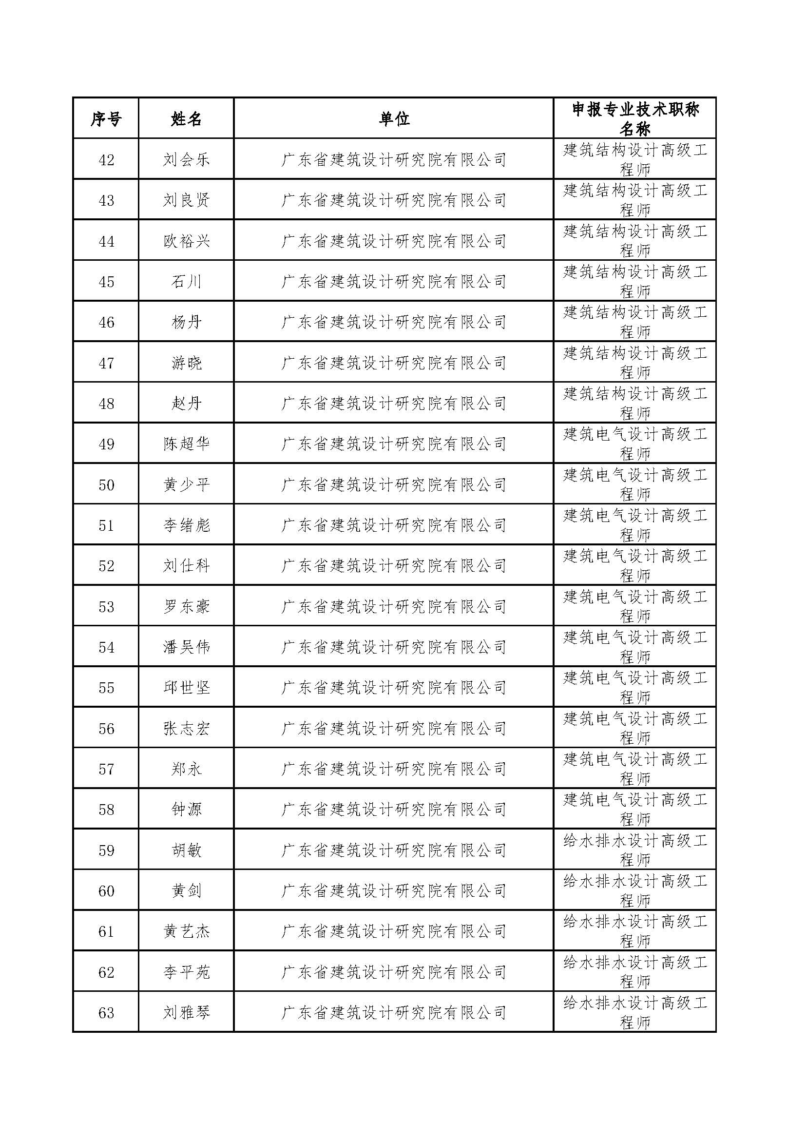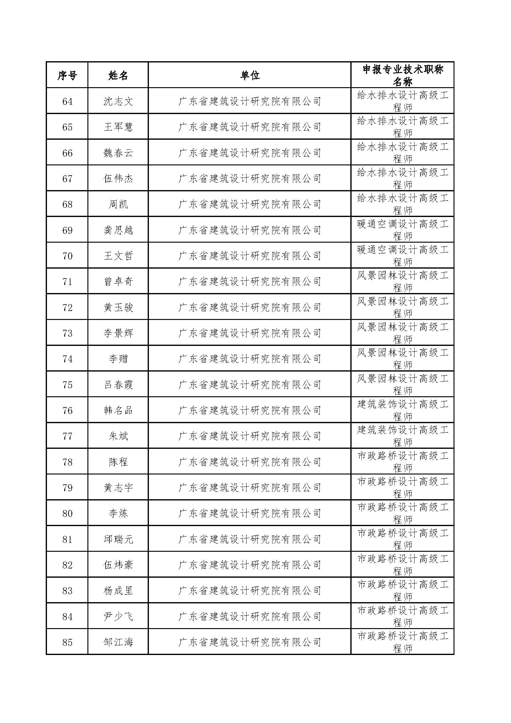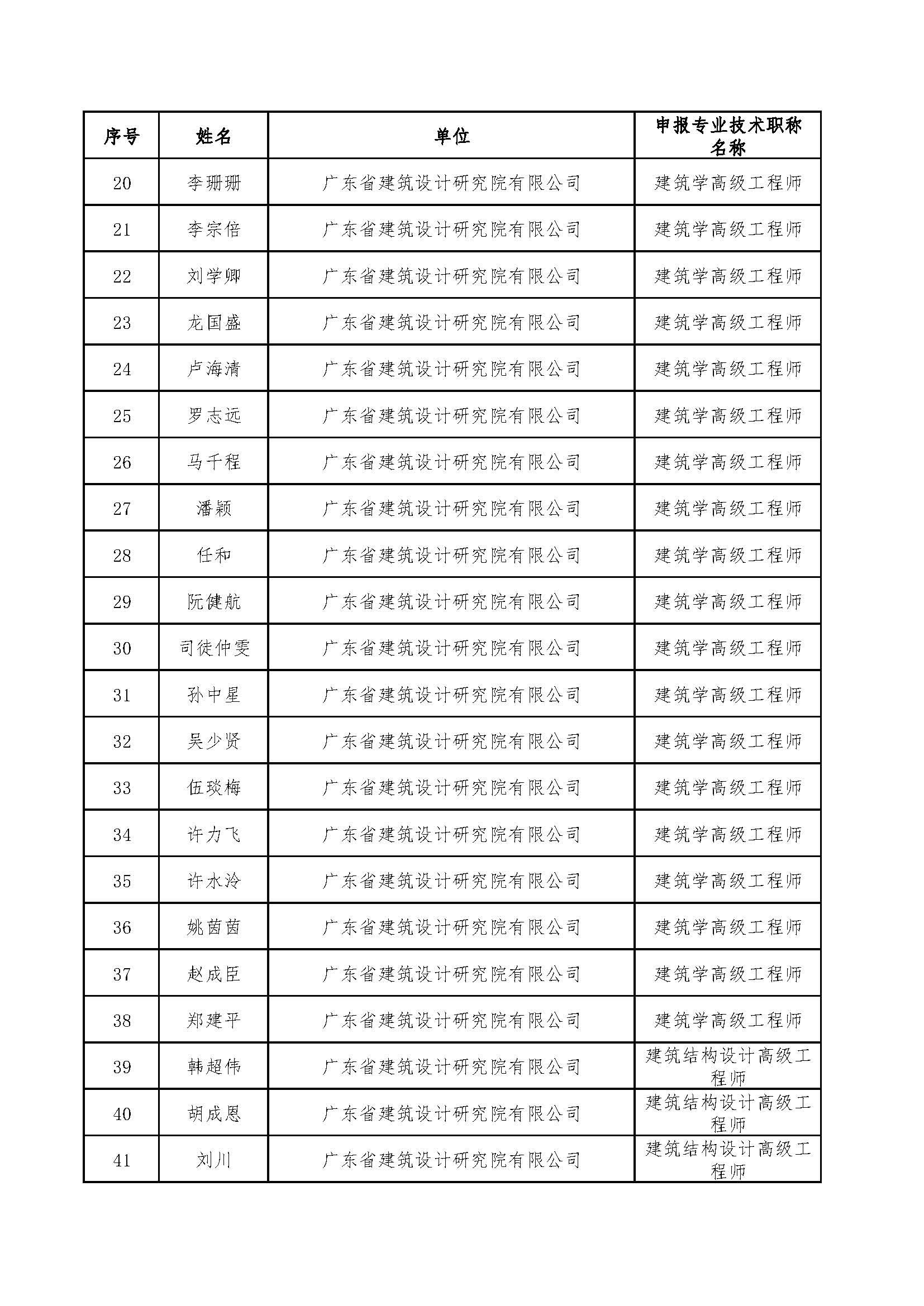 经广东省建筑工程技术高级专业技术资格评审委员会评审及认定,2023年度广东省建筑工程高级工程师及以下级别职称共通过4822人,其中广东省建筑设计研究院有限公司陈嘉恒等3119人通过高级工程师职称评审;广东省城乡规划设计研究院科技集团股份有限公司白钰等717人通过工程师职称评审;广东省建筑设计研究院有限公司唐鑫等385人通过助理工程师职称评审;广东省建筑设计研究院有限公司邓少珍等106人通过技术员职称评审;广东省建筑设计研究院有限公司周尤敏等82人通过工程师职称认定;广东省建筑设计研究院有限公司陈晓程等408人通过助理工程师职称认定;广东省建筑设计研究院有限公司罗达猛等5人通过技术员职称认定(名单见附件1-7)。现予以公示。